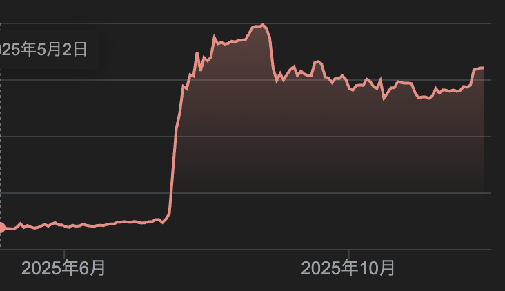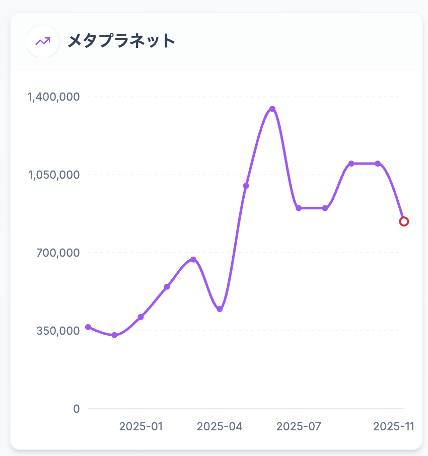 以下はメタプラネットの株価です。上の注目指数と照らし合わせてみてください。