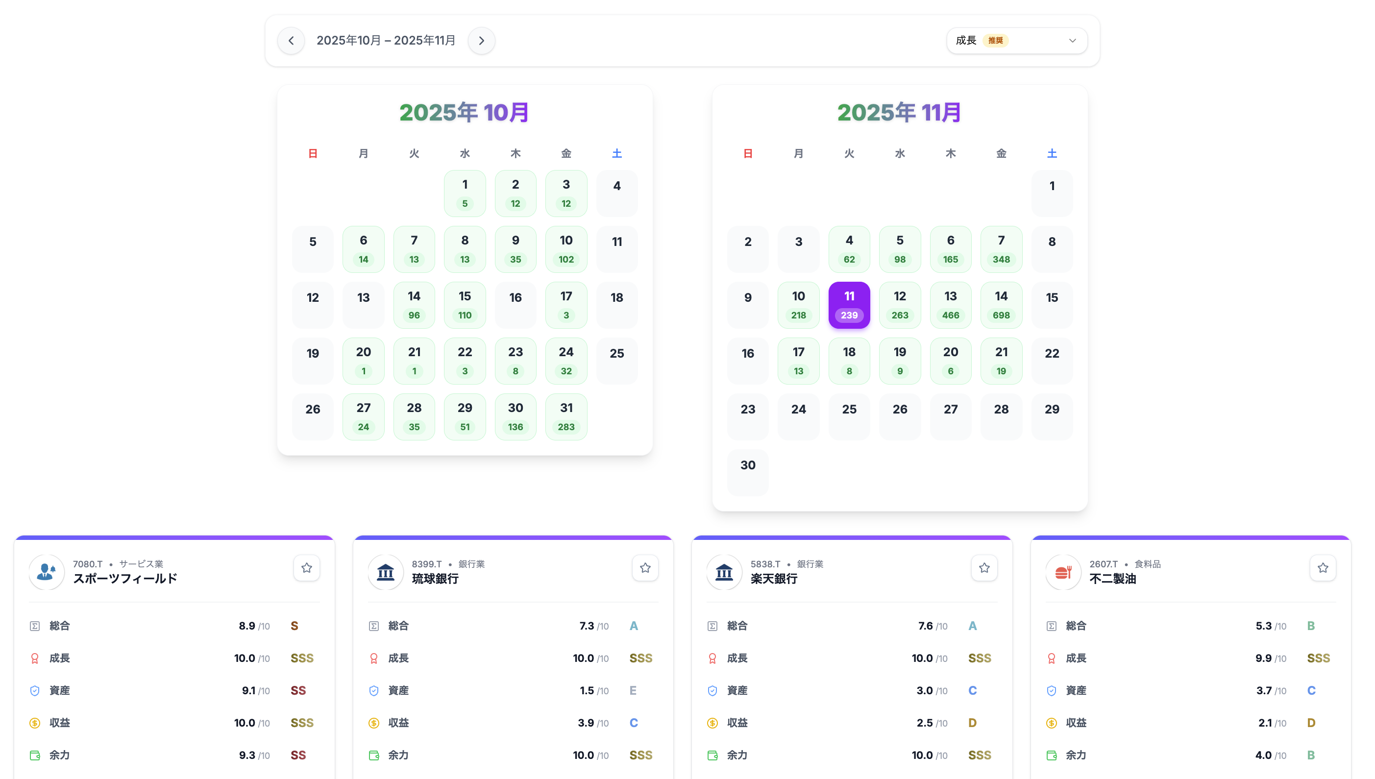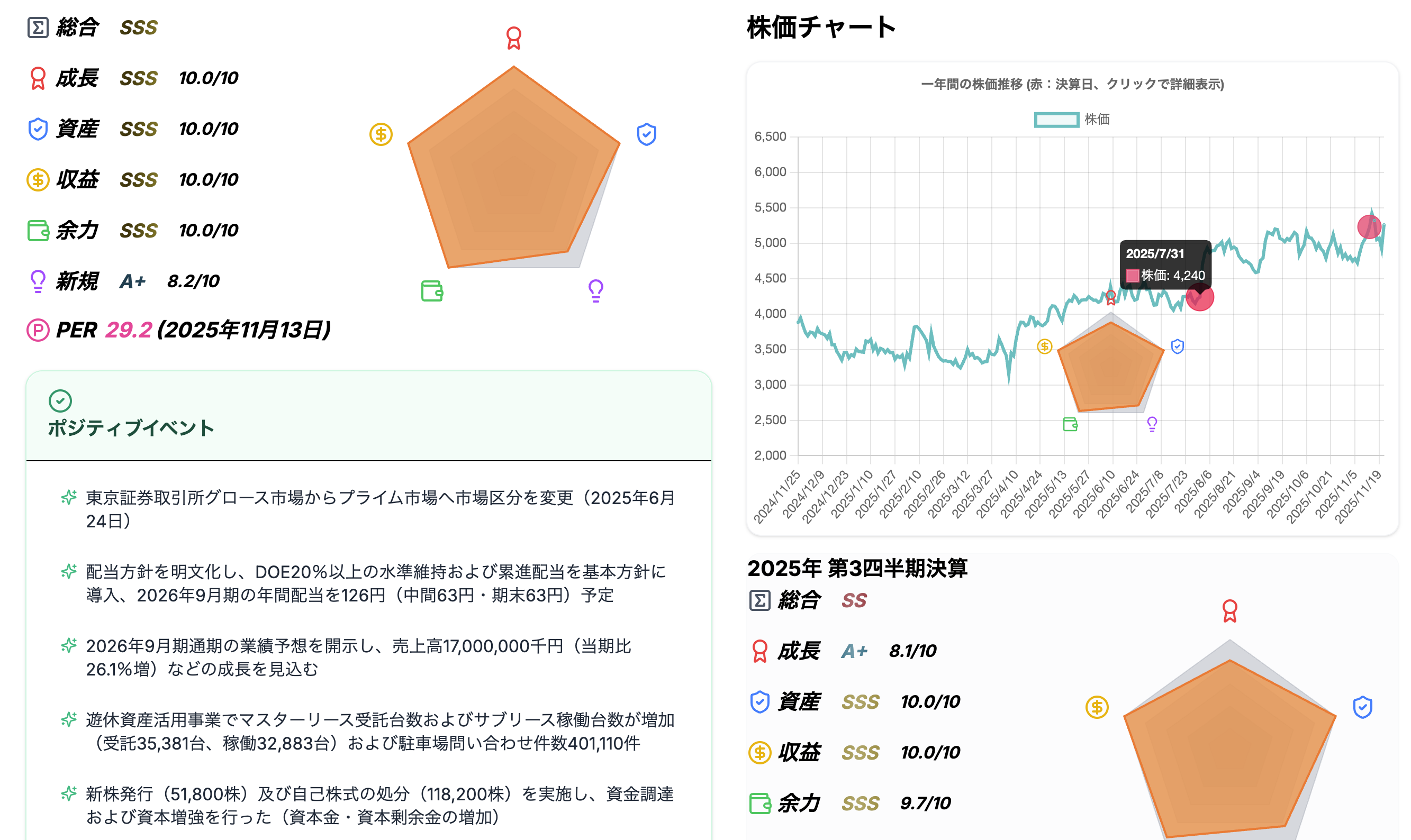 一目で ** 決算・過熱感・スコア ** と株価の比較が可能!