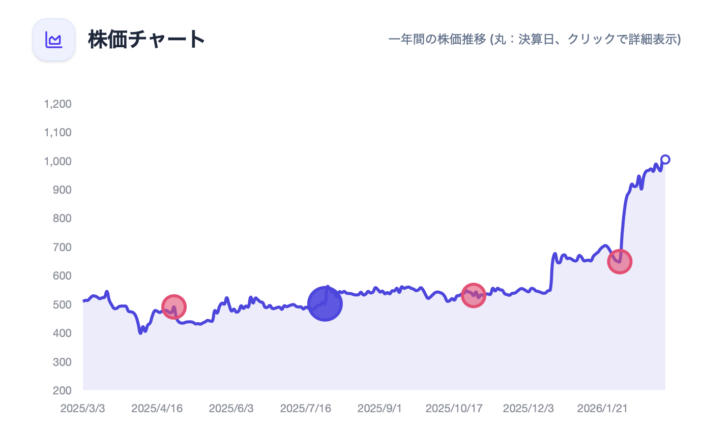 下記はエムケー精工の例ですが、株価の濃い藍色の地点とその時のスコアが画像に表示されています。